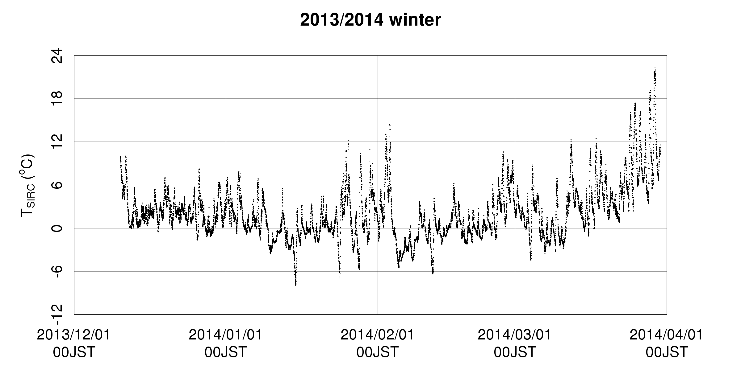 plot(timeexpr, thts$SIRCrojo_T_C, pch=18, cex=0.2, xlim=c(timestt0, timeend2), ylim=c(-12.0, 24.0), yaxp=c(-12.0, 24.0, 6), xlab=””, ylab=expression(paste(T[SIRC], ” (“^”o”, “C)”)), main=”2013/2014 winter” )